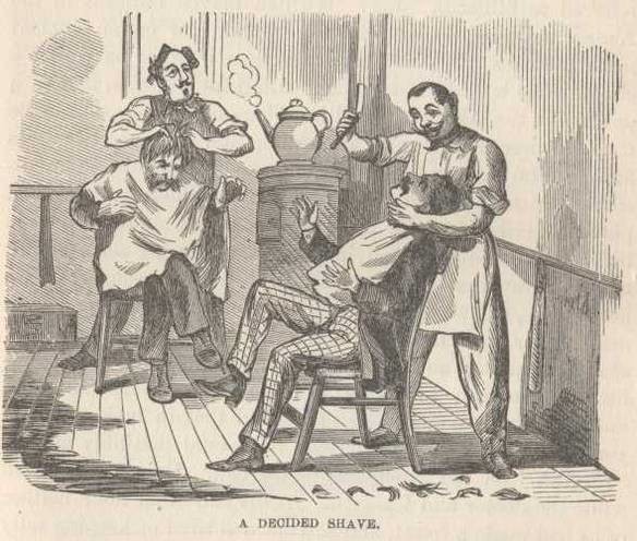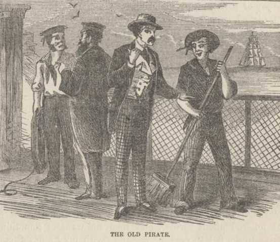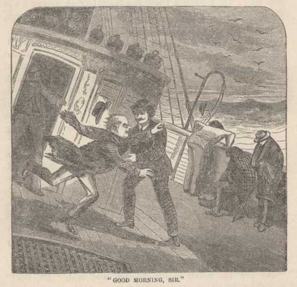 By some happy fortune I was not seasick.—That was a thing to be proud of. I had not always escaped before. If there is one thing in the world that will make a man peculiarly and insufferably self-conceited, it is to have his stomach behave itself, the first day it sea, when nearly all his comrades are seasick. Soon a venerable fossil, shawled to the chin and bandaged like a mummy, appeared at the door of the after deck-house, and the next lurch of the ship shot him into my arms. I said:
