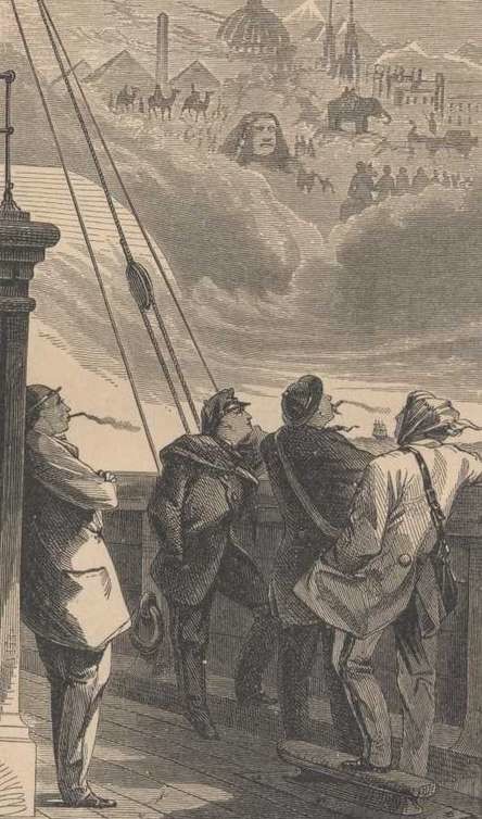 And sure enough, afloat on the placid sea a league away, lay a great city, with its towers and domes and steeples drowsing in a golden mist of sunset.