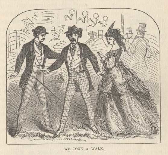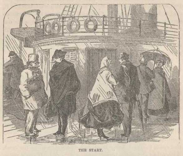 Finally, above the banging, and rumbling, and shouting, and hissing of steam rang the order to "cast off!"—a sudden rush to the gangways—a scampering ashore of visitors-a revolution of the wheels, and we were off—the pic-nic was begun! Two very mild cheers went up from the dripping crowd on the pier; we answered them gently from the slippery decks; the flag made an effort to wave, and failed; the "battery of guns" spake not—the ammunition was out.