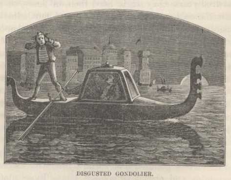 There was music every where--choruses, string bands, brass bands, flutes, every thing. I was so surrounded, walled in, with music, magnificence and loveliness, that I became inspired with the spirit of the scene, and sang one tune myself. However, when I observed that the other gondolas had sailed away, and my gondolier was preparing to go overboard, I stopped.