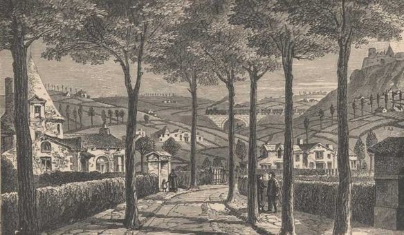 We whisked by many a gray old medieval castle, clad thick with ivy that swung its green banners down from towers and turrets where once some old Crusader's flag had floated. The driver pointed to one of these ancient fortresses, and said, (I translate):