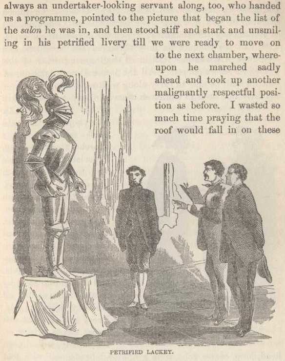 Twilight was approaching. Fifty harlequins, in flowing robes, approached this castle wearily, for they were on foot, and the dust upon their garments betokened that they had traveled far. They overtook a peasant, and asked him if it were likely they could get food and a hospitable bed there, for love of Christian charity, and if perchance, a moral parlor entertainment might meet with generous countenance--"for," said they, "this exhibition hath no feature that could offend the most fastidious taste."