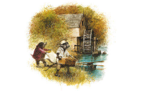 Уйдя со стрежня, они прошли в озерцо, на первый взгляд с рекой не связанное. Его отлогие берега покрывала зелёная трава, под водой извивались тёмные корни деревьев, а чуть поодаль стояла старая мельница, до самых стропил окутанная облаком серебристых брызг и пены, и в такт бесконечному движению колеса воздух звенел монотонным усыпляющим напевом, через который изредка прорезáлись чьи-то звонкие и чистые голоса. Крот мог только сложить передние лапы и восхищённо вздыхать.