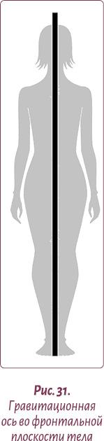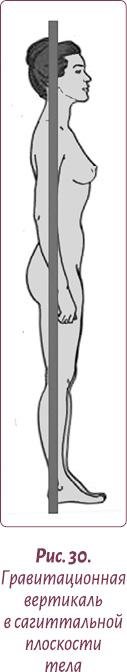 С точки зрения биомеханики эталонная ось, обеспечивающая правильную осанку, проходит в боковой плоскости через несколько ключевых точек: центр наружного слухового прохода должен находиться на одной линии с головкой плеча, головкой тазобедренной кости и серединой пятки. Крайними точками этой вертикали являются промежность и большой родничок (рис. 30).