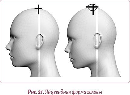 Если голова из-за перетягивания «костюмчика» через фасции оболочек спинного мозга наклоняется вниз, ее большой родничок отклоняется от вертикали, а голова из-за веностаза приобретает яйцевидную форму (рис. 21).