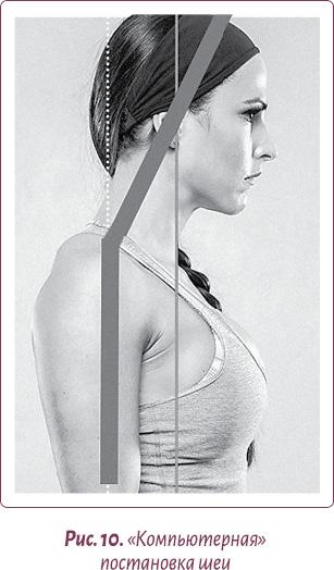 А вот для молодого поколения, особенно в наше время, характерен третий дефект статики шеи, который я назвала «компьютерной» шеей (рис. 9). Его обычно провоцирует именно вытягивание шеи к экрану монитора.