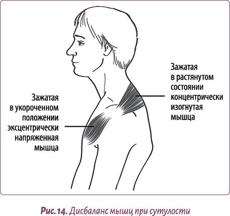 Другой проблемой, подстерегающей «канцелярско-компьютерного» работника, являются спазмированные трапеции. Плечи в этом случае приподнимаются из-за спины, становятся жесткими и болезненными при разминании (рис. 14).