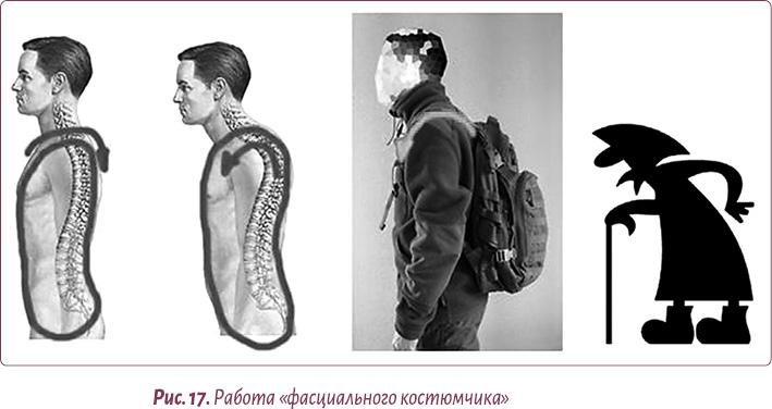Сползающий «костюмчик» тянет вниз мышцы и фасции передней части шеи, а они в свою очередь стягивают подбородок и овал лица. Такой дисбаланс возникает с возрастом практически у всех людей, но особенно наглядно проявляется у женщин из-за слабости их мышечной системы и тяжести молочных желез. Поэтому передняя поверхность тела у женщин тянется вниз сильнее, чем у мужчин, сворачивая их, как испуганных ежиков (рис. 16).