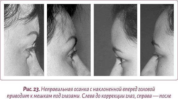 Примите как аксиому: пока не решены проблемы с шеей и осанкой — серьезного улучшения вида лица, особенно нижней его части, ждать не приходится. А если не в порядке и лимфосистема, то совсем кричи караул — все обвислости наполняются водой и жиром: и шея, и овал, и носогубные складки, и веки (рис. 23).