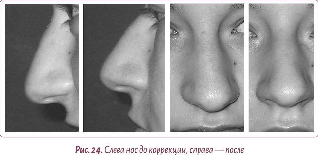 То же самое происходит и в отношении длины носа (рис. 24). При постоянно опущенном вниз лице нос, подпитываясь лишней жидкостью, сливающейся сверху в его кончик, начинает свисать каплей и увеличиваться в размере. Как видите, после восстановления статики шеи все приходит в норму.
