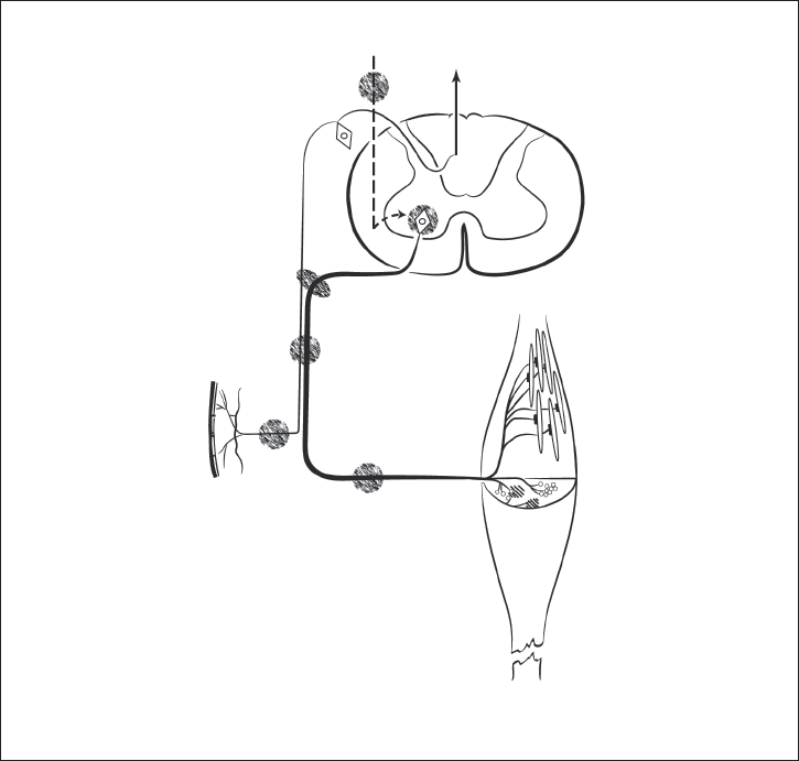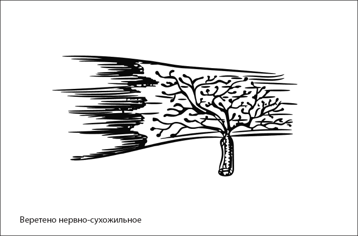 Позволяет избежать травмы. Импульс к мышце поступает двумя потоками. Первый идет к мышечному брюшку (для выполнения сокращения). Одно место прикрепления стабилизируется, а другое за счет движения меняет пространственное положение. Так возникает движение. Другой поток идет к сухожилию мышцы (рис. 8). Он включается для торможения сигнала, направленного на сокращение брюшка мышцы и ограничение избыточного сокращения (рис. 9). Механизм работы таков: избыточное сокращение активизирует рецепторы сухожилия и возбуждение, направленное на сокращение мышцы, тормозится.