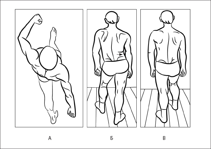 Рис. 7. Оптимальность выполнения ходьбы. А – правильное выполнение двигательного стереотипа «ходьба». Перекрестное движение рук и ног совершается в полном объеме. Б, В – неправильное выполнение двигательного стереотипа «ходьба». Руки не совершают перекрестное движение относительно ног. Появляются дополнительные движения в области таза.