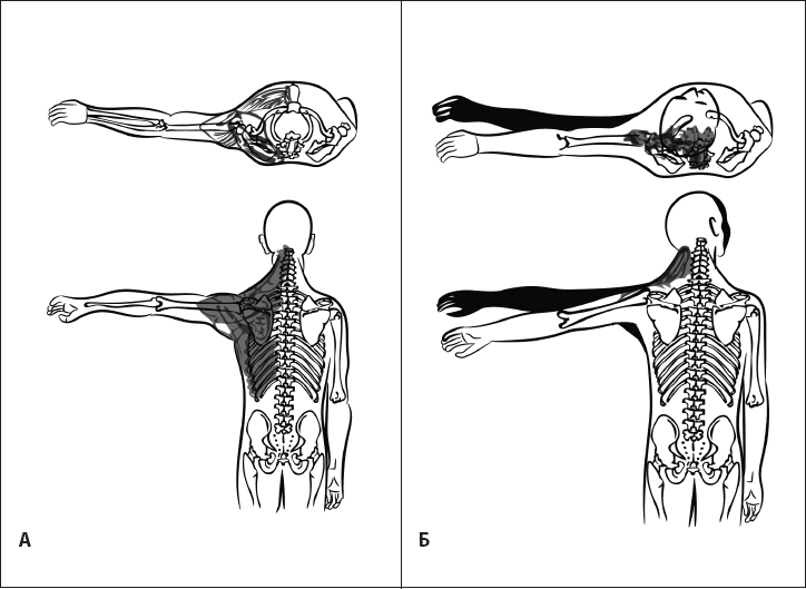 Рис. 3. Оптимальность выполнения подъема руки. А – человек поднимает руку правильно, при помощи мышц плечевого сустава. Б – человек поднимает руку неправильно, при помощи мышц шеи.