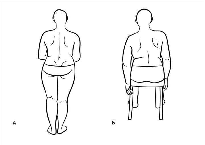 Рис. 4. Оптимальность статического стереотипа. Боль в области шеи провоцируется сидячим положением тела. А – в вертикальном положении боли нет. Б – боль и асимметрия туловища возникают в сидячем положении. Причина боли – нестабильность таза.