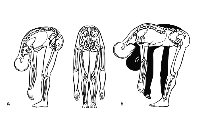 Рис. 5. Оптимальность выполнения наклона тела. А – правильное выполнение наклона туловища вперед за счет сокращения прямых мышц живота и сгибания поясничного региона. Б – неправильное выполнение наклона тела вперед за счет сокращения пояснично-подвздошной мышцы.
