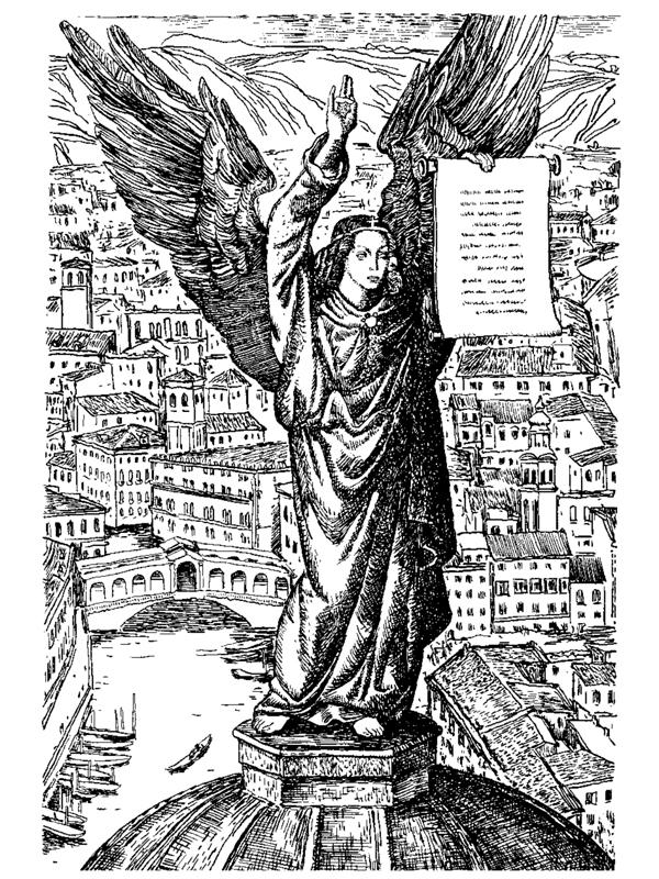 В комнате за Скрипториумом дядя Лоренцо и кузен Доменико штемпелевали зеленые конверты — ставили на них крылатого коня. Окинув проходящих мимо отца с сыном пристальным взглядом, дядя Лоренцо решил, что беда не так велика, чтобы Старый Никколо не справился с ней один. Он кивнул Паоло и сделал вид, будто хочет тиснуть ему на лоб крылатого коня.